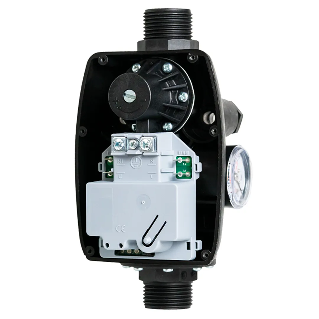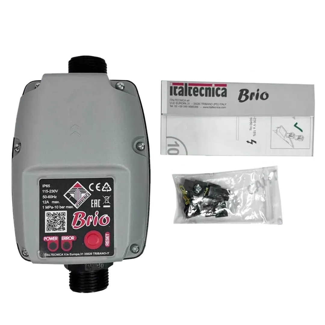 Реле давления Italtecnica BRIO2000 применяется для автоматического включения и выключения однофазных электронасосов мощностью до 2 л.с. Полностью заменяет традиционно используемые автоматические станции водоснабжения, состоящие из реле давления и гидроаккумулятора. Включает электронасос после падения давления в системе (открытые краны) и выключает его, когда прерывается поток воды при максимальном значении давления для электрического насоса (краны закрыты). Кнопка RESET (сброс) 2. Индикатор остановки (сухой ход) 3. Индикатор напряжения сети 4. Клеммы подключения насоса 5. Винт для регулировки давления срабатывания 6. Вход с резьбовым соединением 1" резьба="" наружная="" предзаказу="" внутренняя="" вращающая="" Подключения="null" питания="" Выход="null" с="" резьбовым="" соединением="" Манометр="null" в="" версии="">