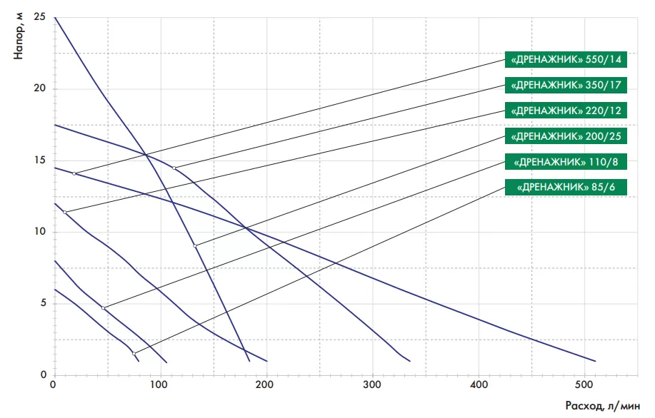 Графические характеристики дренажного насоса ДЖИЛЕКС ДРЕНАЖНИК 200/25