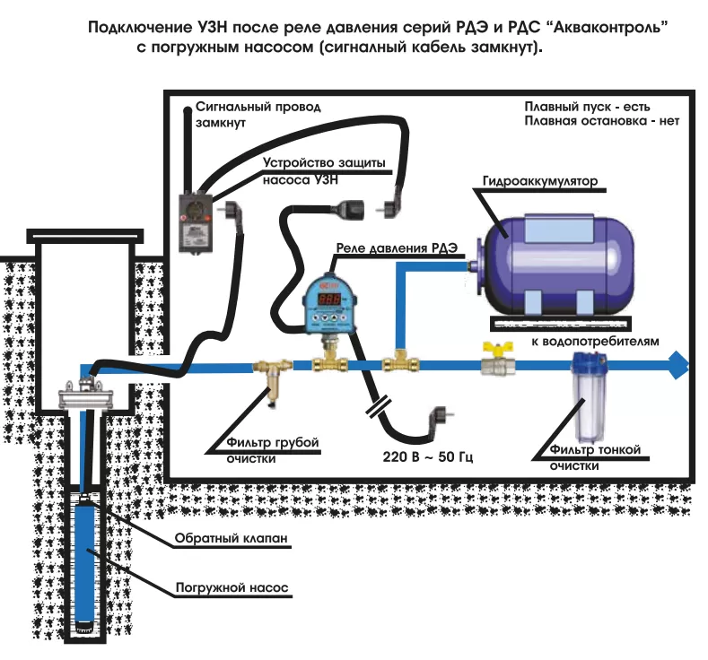 УЗН-2,5С (устройство защиты насоса) предназначено для управления и защиты скважинных и дренажных насосов. УЗН обеспечивает плавный пуск и плавную остановку подключенного насоса, а также обеспечивает его защиту от перегрузок по току и напряжению и от сухого хода. УЗН обладает функцией "обучения" характеристикам подключённого насоса, что позволяет применять УЗН для любого насоса, подходящего соответствующей модели УЗН по мощности Защита по сухому ходу осуществляется без использования датчика давления или датчика протока.
