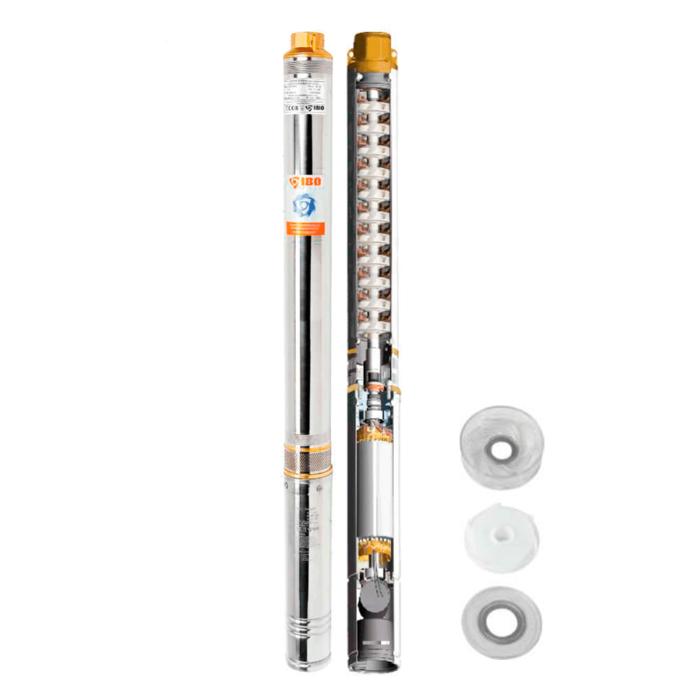 Насос для скважины IBO 3Ti 37 3–х дюймовые многоступенчатые погружные насосы диаметром 74 мм с повышенной стойкостью к песку, рассчитаны на 3 и 4– дюймовые скважины. Напорная характеристика насоса составляет 152 м при максимальной производительности в 3 м³/час, при этом мощность электродвигателя составляет 1100 Вт. Эффект повышенной устойчивости к песку был достигнут благодаря использованию «плавающих лопастных колес» и выбору износостойких материалов: латуни, нержавеющей стали AISI 304 и высококачественного пластика. В связи с этим гарантийный срок на насос 1100 Вт предоставляется на 2 года Конденсатор насоса IBO 3Ti 37 встроен в двигатель, благодаря чему электрическая установка намного проще, чем в случае насосов со стартовой коробкой. Длинна кабеля насоса 1100 Вт составляет 1 м. Насосы оснащены тепловой защитой, установленной в обмотке двигателя. Насосы серии 3” Ti благодаря своей бесперебойной работе и высоким параметрам были признаны чаще всего устанавливаемыми насосами в Польше.
