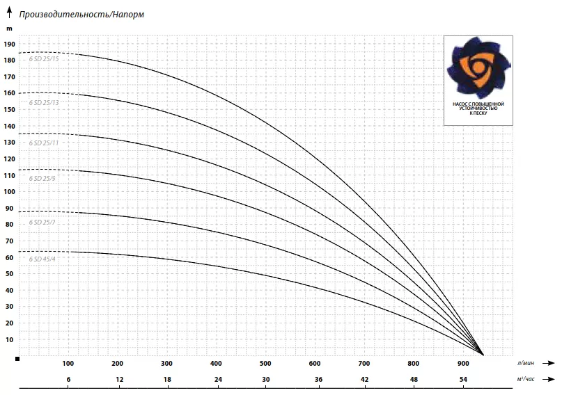 Трехфазный скважинный погружной насос IBO 6SD 25/11 диаметром 146 мм с повышенной устойчивостью к песку. Насос IBO 6SD 25/11 доступен к покупке с двигателями IBO и итальянскими двигателями IBO ITALY. В насосе IBO 6SD 25/11 используется технология «плавающих лопастных колес», а также для основных рабочих элементов насоса применяются износостойкие материалы: латунный нагнетательный патрубок, корпус, вал и сетка фильтра выполнены из нержавеющей стали AISI 304 / а также лопастные колеса выполнены из высококачественной пластмассы, Благодаря этому насос IBO 6SD 25/11 имеет повышенную стойкость к песку. Насос комплектуется кабелем 1 м, по желанию его можно нарастить до нужного размера. Скважинный насос IBO 6SD 25/11 имеет отличные характеристики. Напор насоса в максимальной точке составляет 135 м, а производительность достигает максимального показателя в 55.2 м³/час. Мощность двигателя составляет 11000 Вт, то вполне неплохо для насоса с такими напорно-расходными характеристиками. Насосы серии SD марки ИБО были первыми насосами на рынке, названными «анти–песочными». Они по прежнему являются одними из немногих скважинных насосов на рынке, которые имеют конструкции с такой высокой устойчивостью к песку. Максимальное содержание песка в воде – до 5%. Насос IBO 6SD 25/11 можно применять как аналог насосов ЭЦВ.