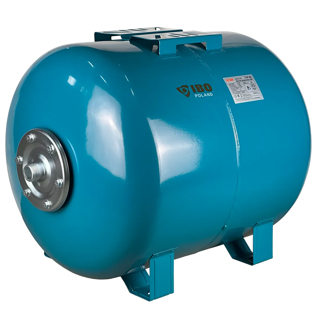 Горизонтальный мембранный бак для воды IBO объемом 80 литров. Бак выполнен из стали и покрыт специальным антикоррозионным составом. Мембрана бака выполнена из пищевой резины на основе бутилкаучука. Бак снабжен приварной площадкой для установки поверхностного насоса. В нижней части бака установлены металлические кронштейны с целью крепления бака к поверхности.