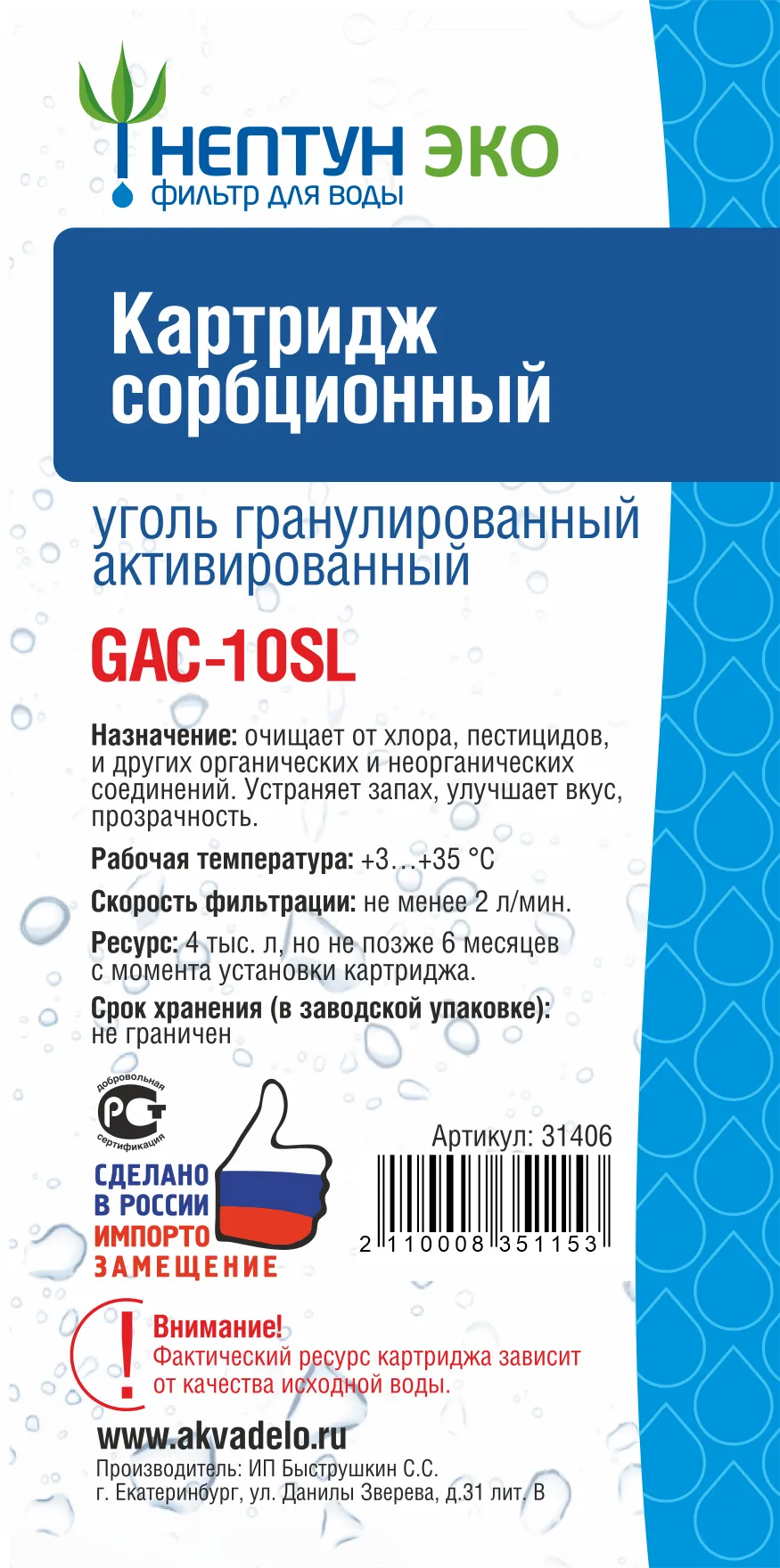 Реальный ресурс зависит от качества исходной воды. Картридж подлежит замене по окончании ресурса, но не реже 1 раза в 6 месяцев.