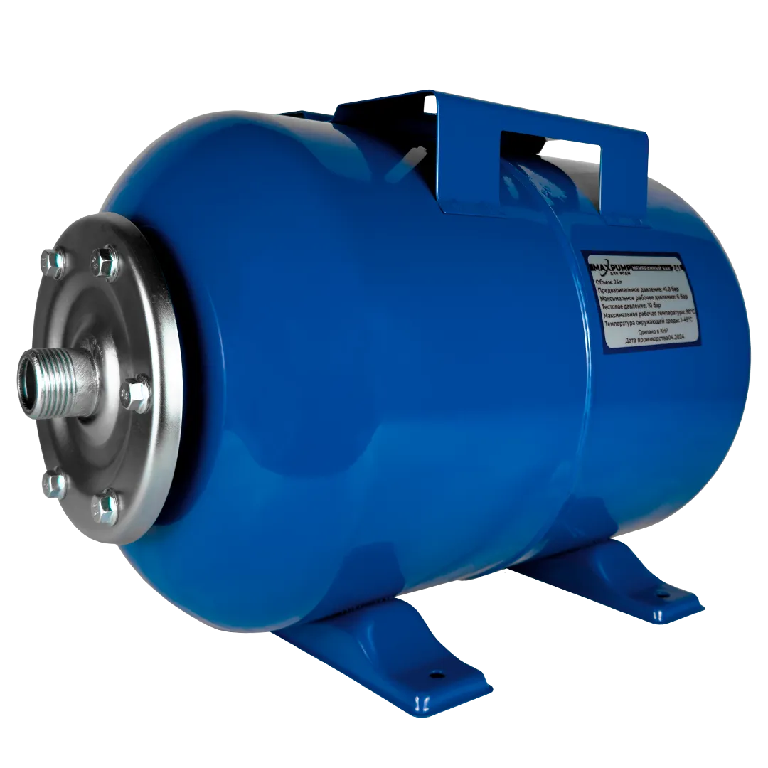 Гидроаккумулятор для воды MAXPUMP H-24 горизонтального исполнения предназначен для систем холодного водоснабжения. Гидроаккумулятор служит для накапливания запаса воды объемом до 24 литров, снижения вероятности возникновения гидравлических ударов в системе, а также сокращения количества пусков насоса, тем самым продлевая срок службы насоса. Конструкция гидроаккумулятора представляет собой стальной корпус, окрашенный в зеленый цвет, со сменной мембранной, изготовленной из высококачественного материала EPDM, опорными ножками у основания бака, воздушным клапаном и площадкой для установки насоса. Горизонтальные гидроаккумуляторы, благодаря установочной площадке, расположенной на поверхности бака, могут использоваться с поверхностными насосами.