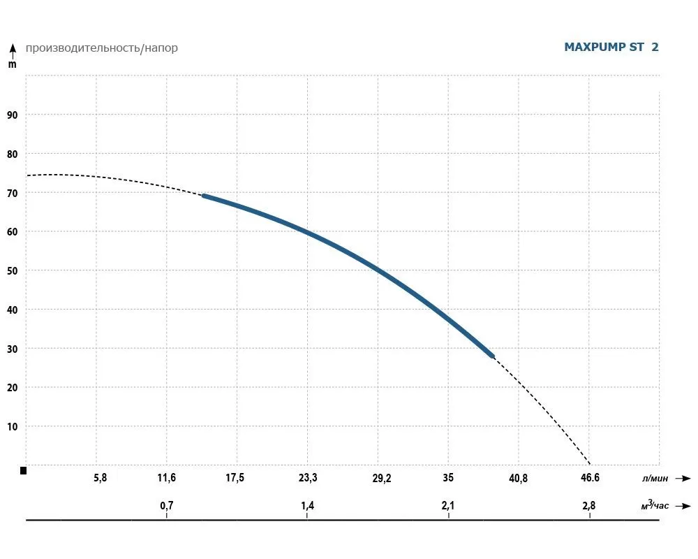 Центробежный, многоступенчатый насос MAXPUMP ST 2 кабель 40 метров с помощью 550 Вт которого можно обеспечить стабильную подачу воды в дом из скважины диаметром от 90мм до 125мм. Модель отличается простотой установки, подключения и технического обслуживания. Она изготовлена из высококачественных прочных материалов, обеспечивающих ей долговечный срок службы при условии правильной эксплуатации. Прибор способен подавать воду на высоту до 72 м, за один час перекачивает максимально 2.8 м³/час. Подключается к однофазной сети с напряжением в 230 В. Конструкция напорной скважинного насоса части позволяет перекачивать воду с небольшим количеством примесей песка. Добились этого благодаря установки в напорную часть насоса плавающих рабочих колес изготовленных из норила. Конструкция двигателя маслозаполненный, обмотка двигателя утолщенная из меди. Напорный патрубок и соединяющая часть двигатель и гидравлику изготовлены из латуни. Насос комплектуется пищевым водопогружным кабелем длинной 40 м.