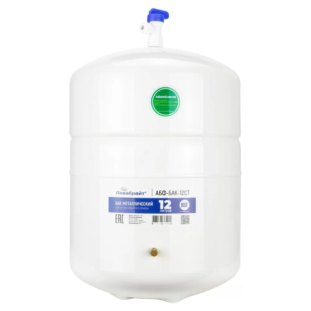 Накопительный стальной бак АКВАБРАЙТ объемом 12 литров предназначен для накопления очищенной питьевой воды в системах обратного осмоса. Изготовлен из металла, белого цвета, с рабочим давлением воздуха от 0.4 до 0.5 атмосфер и подключением по резьбе 13 мм (¼«). Не комплектуется краном.