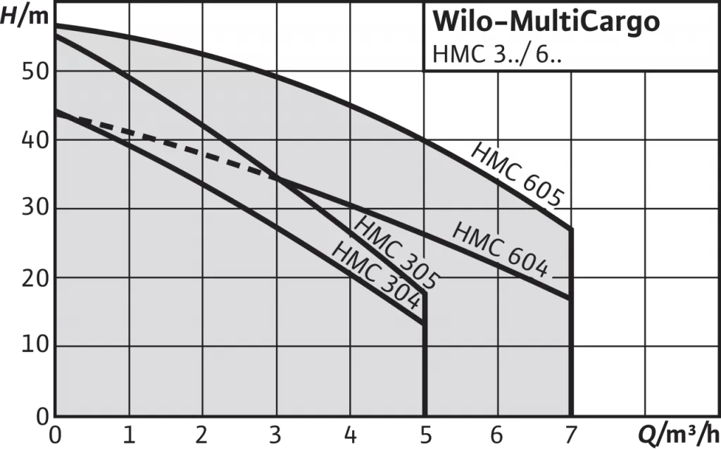 Насосная станция WILO HMC 605 EM - установка с центробежным насосом в компактном исполнении с горизонтальным всасывающим и вертикальным напорным патрубком, которая состоит из следующих компонентов: самовсасывающий многоступенчатый горизонтальный высоконапорный центробежный насос с низким уровнем шума со сквозным насосным валом электродвигателя и не зависящим от направления вращения скользящим торцовым уплотнением. Напрямую присоединенный фланцами однофазный или трехфазный электродвигатель со встроенным термическим защитным выключателем и конденсатором в исполнении для однофазного тока. Система управления насосом с управляющим агрегатом и мембранным напорным баком емкостью 50 л, манометрическим выключателем и манометром (0–6 бар).