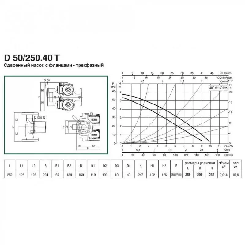 Циркуляционный насос DAB D 50/250.40 T - 400 v предназначен для эксплуатации в системах отопления, где предъявляются повышенные требования к надежности. Отличительной чертой серии D является наличие второго дублирующего насоса, который автоматически включается в работу при поломке первого насоса. Таким образом в одном корпусе расположены сразу два отдельных насоса которые полностью дублируют друг друга. Присоединение насоса с помощью фланцев.