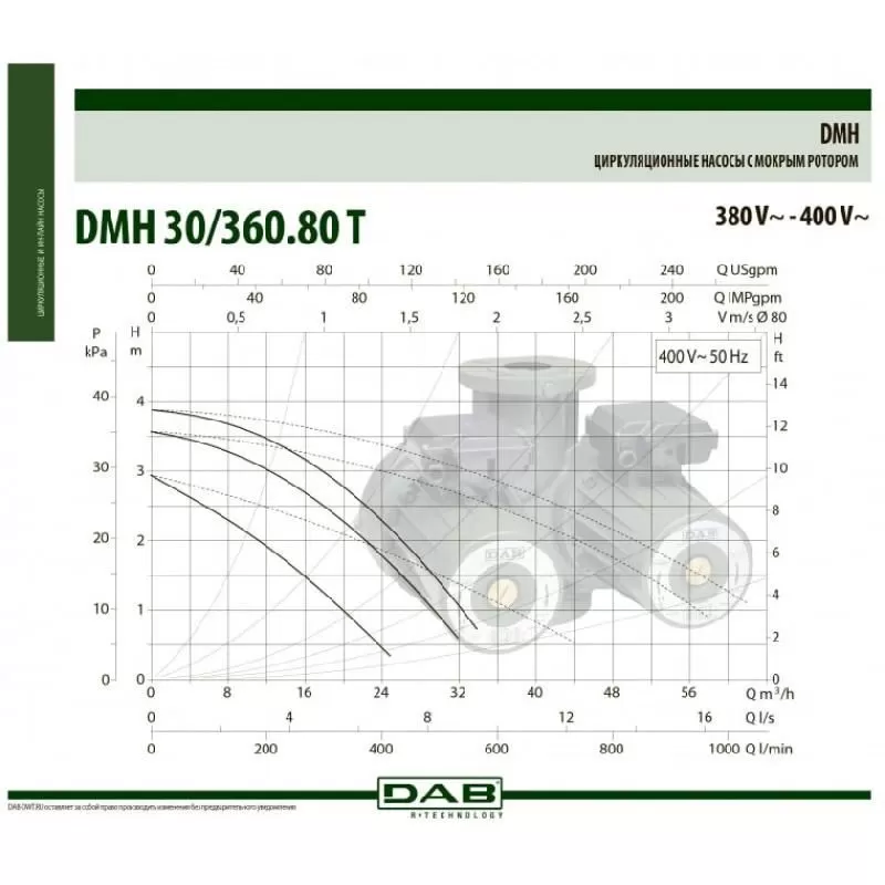 Циркуляционный насос DAB DMH 30/360.80 T эксплуатируется, в основном, для циркуляции теплоносителя в системах отопления или кондиционирования. Насосы DMH имеют две либо три фиксированных скорости вращения. Подшипники насоса смазываются перекачиваемой жидкостью.