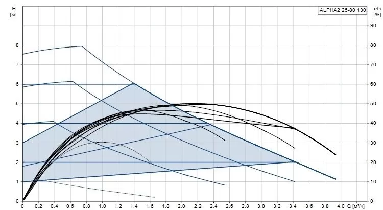 Циркуляционный насос Grundfos ALPHA2 25-80 130 NEW используется для циркуляции воды или гликольсодержащих жидкостей в регулируемых системах отопления и в системах отопления с переменным расходом. ALPHA2 NEW оснащены 10 режимами управления: 3 режима фиксированной скорости, 3 режима пропорционального давления, 3 режима постоянного давления и наиболее энергоэффективный режим для работы в контуре с радиаторами: режим AUTOADAPT.